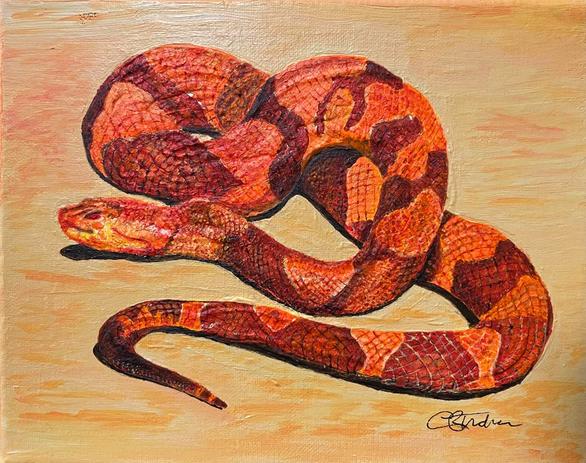 The Copperhead is a species of venomous snake, a pit viper, mainly found in eastern North America, but ranging through most of North America. It favors deciduous forest and mixed woodlands. It may occupy rock outcroppings and ledges, but is also found in low-lying, swampy regions. During the winter, it hibernates in dens or limestone crevices, often together with timber rattlesnakes and black rat snakes.